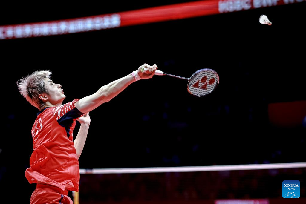 Shi Yuqi of China hits a return during the men's singles final against Christo Popov of France at BWF World Tour Finals 2025 in Hangzhou, east China's Zhejiang Province, Dec. 21, 2025. (Xinhua/Jiang Han)