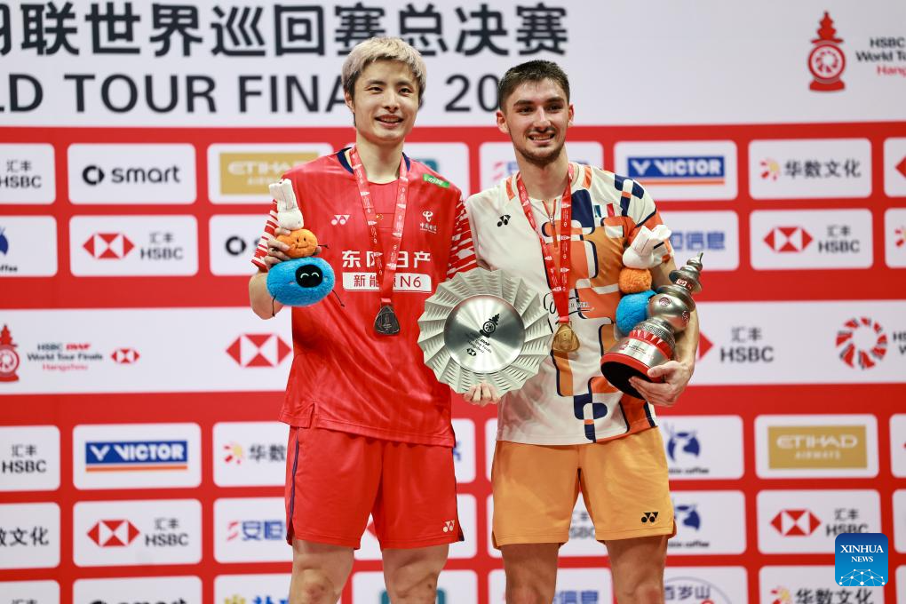 Winner Christo Popov (R) of France and Runner-up Shi Yuqi of China pose during the awarding ceremony for the men's singles final at BWF World Tour Finals 2025 in Hangzhou, east China's Zhejiang Province, Dec. 21, 2025. (Xinhua/Jiang Han)