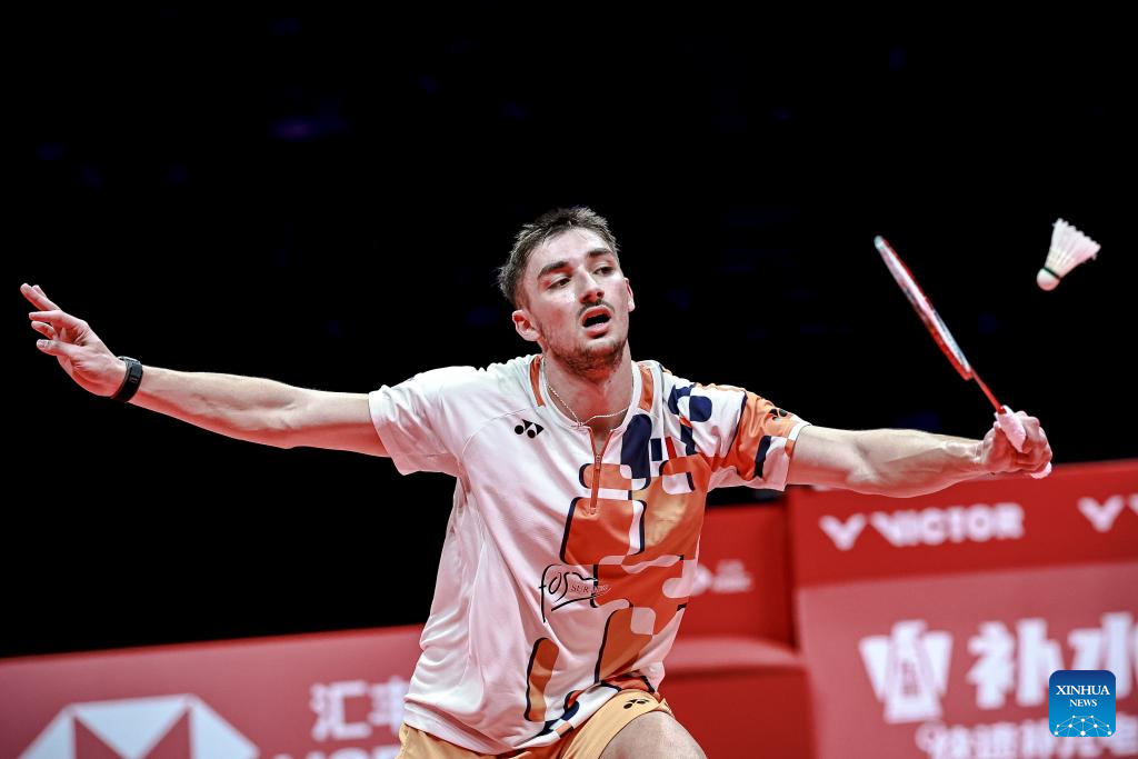 Christo Popov of France hits a return during the men's singles final against Shi Yuqi of China at BWF World Tour Finals 2025 in Hangzhou, east China's Zhejiang Province, Dec. 21, 2025. (Xinhua/Jiang Han)