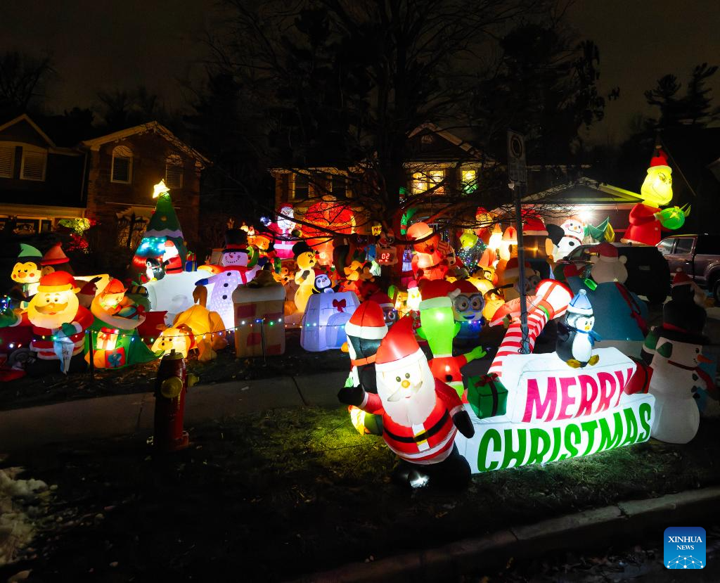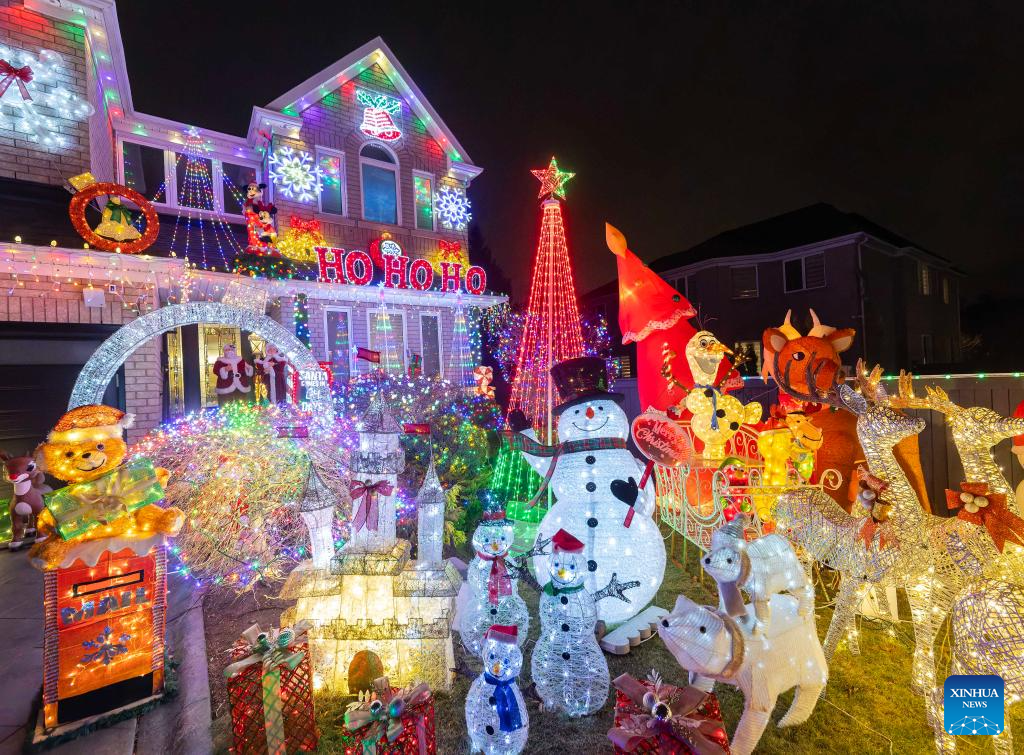 Christmas-themed lights and decorations are pictured outside a house in Mississauga, Ontario, Canada, Dec. 22, 2025. (Photo by Zou Zheng/Xinhua)