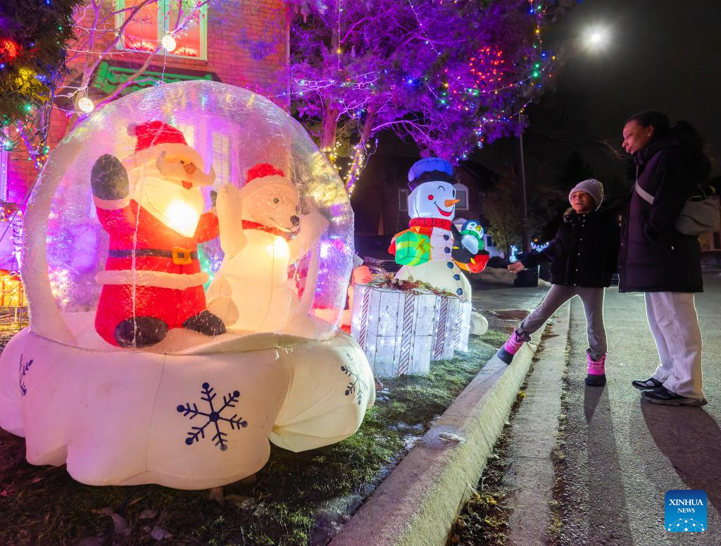 People look at Christmas-themed lights and decorations outside a house in Mississauga, Ontario, Canada, Dec. 22, 2025. (Photo by Zou Zheng/Xinhua)