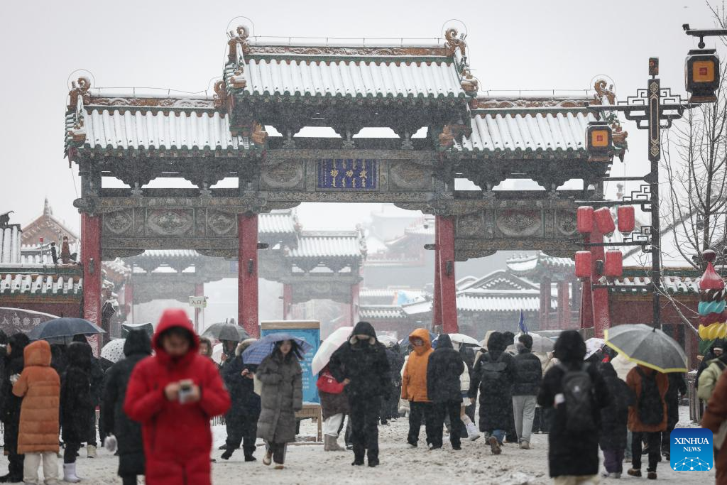 People walk in snow outside Shenyang Palace Museum in Shenyang, northeast China's Liaoning Province, Dec. 23, 2025. A large-scale snowfall hit Liaoning Province on Tuesday. (Xinhua/Pan Yulong)