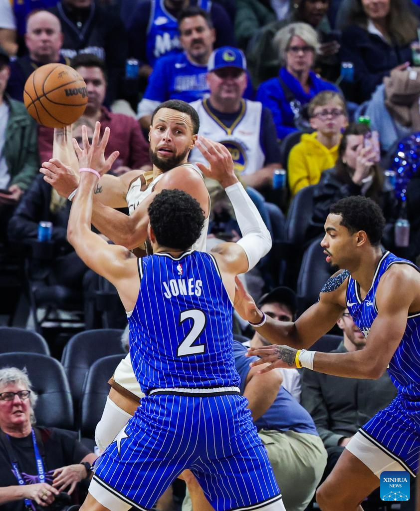 Stephen Curry (top) of Golden State Warriors passes the ball during the 2025-2026 NBA regular season game between Golden State Warriors and Orlando Magic in San Francisco, the United States, Dec. 22, 2025. (Photo by Arthur Dong/Xinhua)