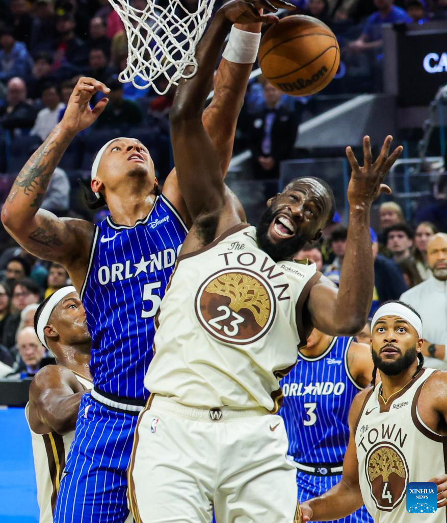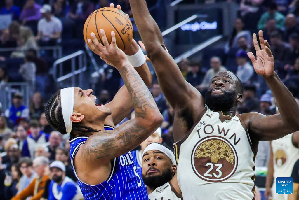 Draymond Green (front R) of Golden State Warriors vies with Paolo Banchero of Orlando Magic during the 2025-2026 NBA regular season game between Golden State Warriors and Orlando Magic in San Francisco, the United States, Dec. 22, 2025. (Photo by Arthur Dong/Xinhua)