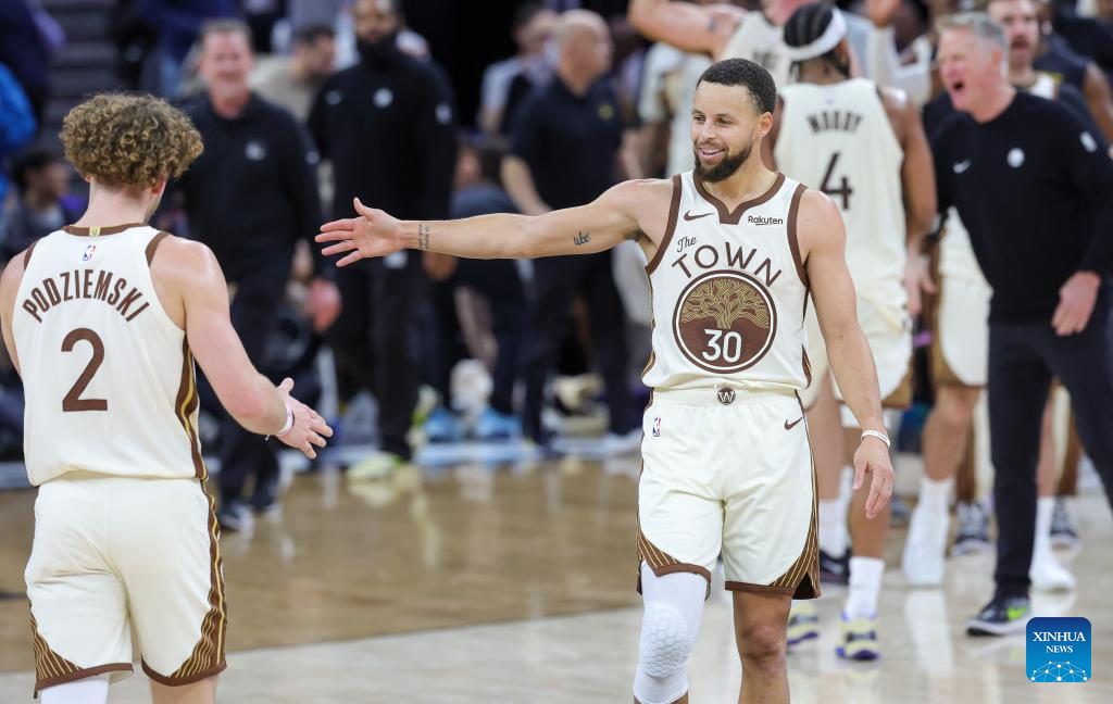 Stephen Curry (R) of Golden State Warriors celebrates scoring during the 2025-2026 NBA regular season game between Golden State Warriors and Orlando Magic in San Francisco, the United States, Dec. 22, 2025. (Photo by Arthur Dong/Xinhua)