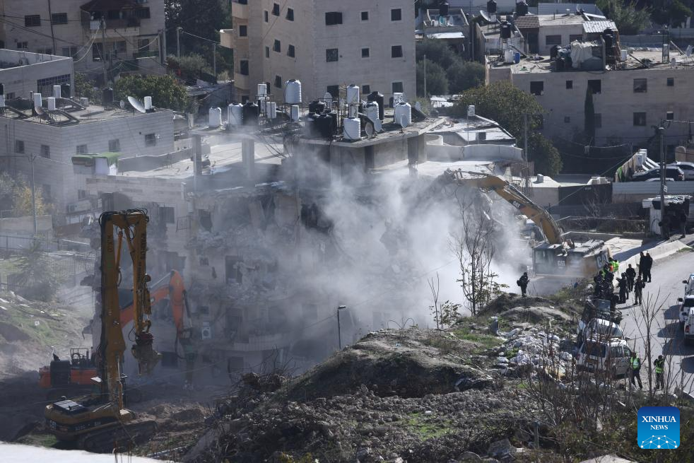 Excavators demolish a residential building in the Silwan neighborhood of east Jerusalem, on Dec. 22, 2025. Israeli forces on Monday demolished a four-floor residential building in Silwan, a Palestinian neighborhood in east Jerusalem. The apartment building, home to about 90 Palestinian residents living in 13 residential units, was the largest residential structure demolished in the area this year, according to Israeli rights group Ir Amim. (Photo by Jamal Awad/Xinhua)