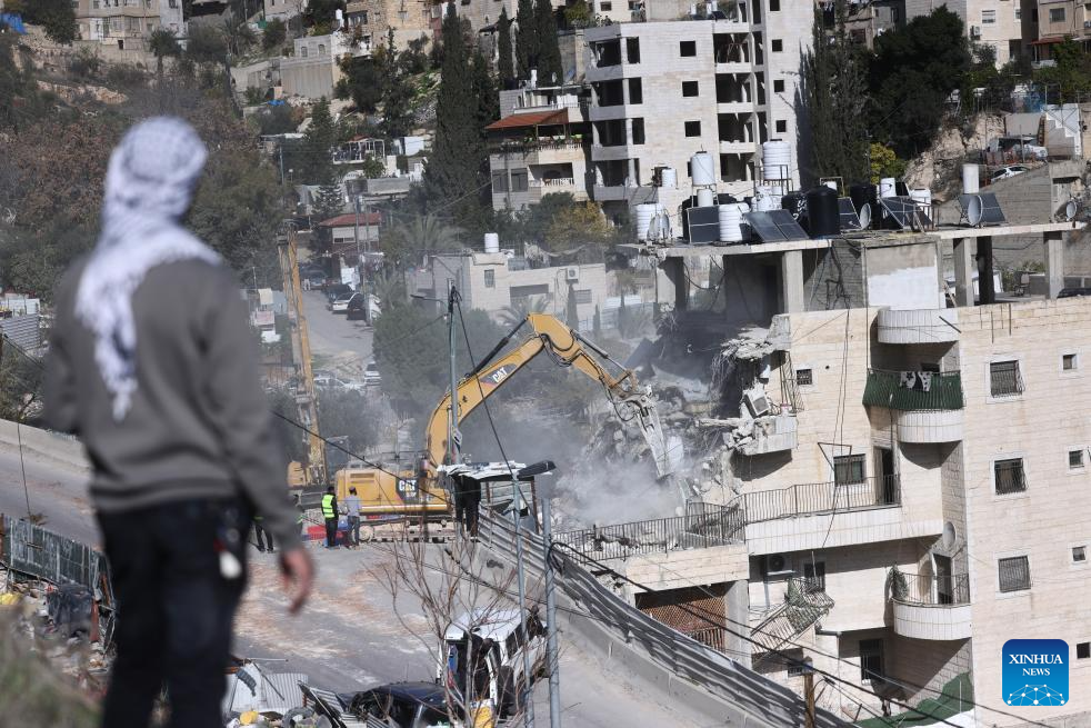A Palestinian man watches as Israeli forces demolish a residential building in the Silwan neighborhood of east Jerusalem, on Dec. 22, 2025. Israeli forces on Monday demolished a four-floor residential building in Silwan, a Palestinian neighborhood in east Jerusalem. The apartment building, home to about 90 Palestinian residents living in 13 residential units, was the largest residential structure demolished in the area this year, according to Israeli rights group Ir Amim. (Photo by Jamal Awad/Xinhua)
