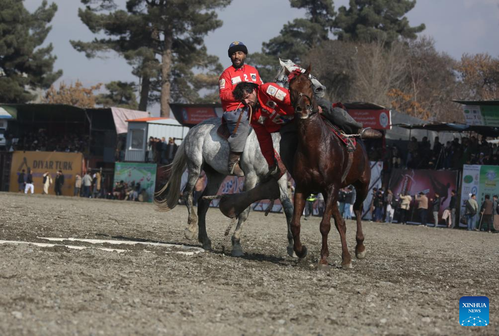 Horse riders compete during a game of Buzkashi in Kabul, capital of Afghanistan, Dec. 21, 2025. (Photo by Saifurahman Safi/Xinhua)