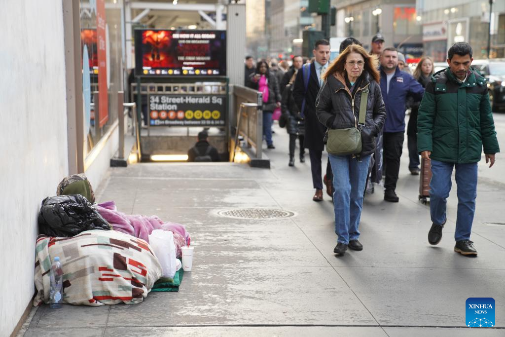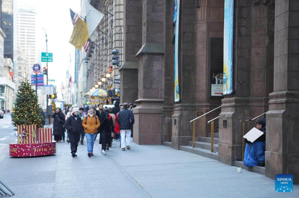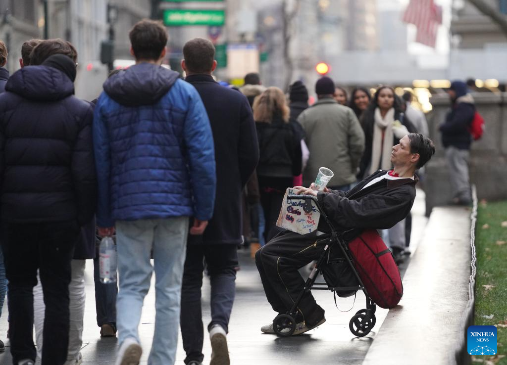 A homeless man seeks help on a street in New York City, the United States, on Dec. 22, 2025. (Xinhua/Zhang Fengguo)