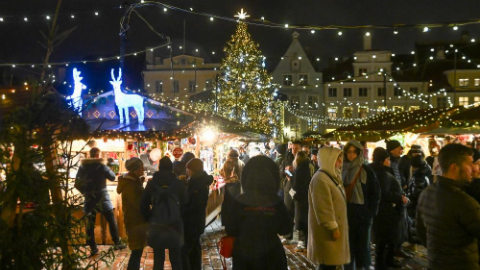 People look at Christmas-themed lights and decorations in Mississauga, Canada