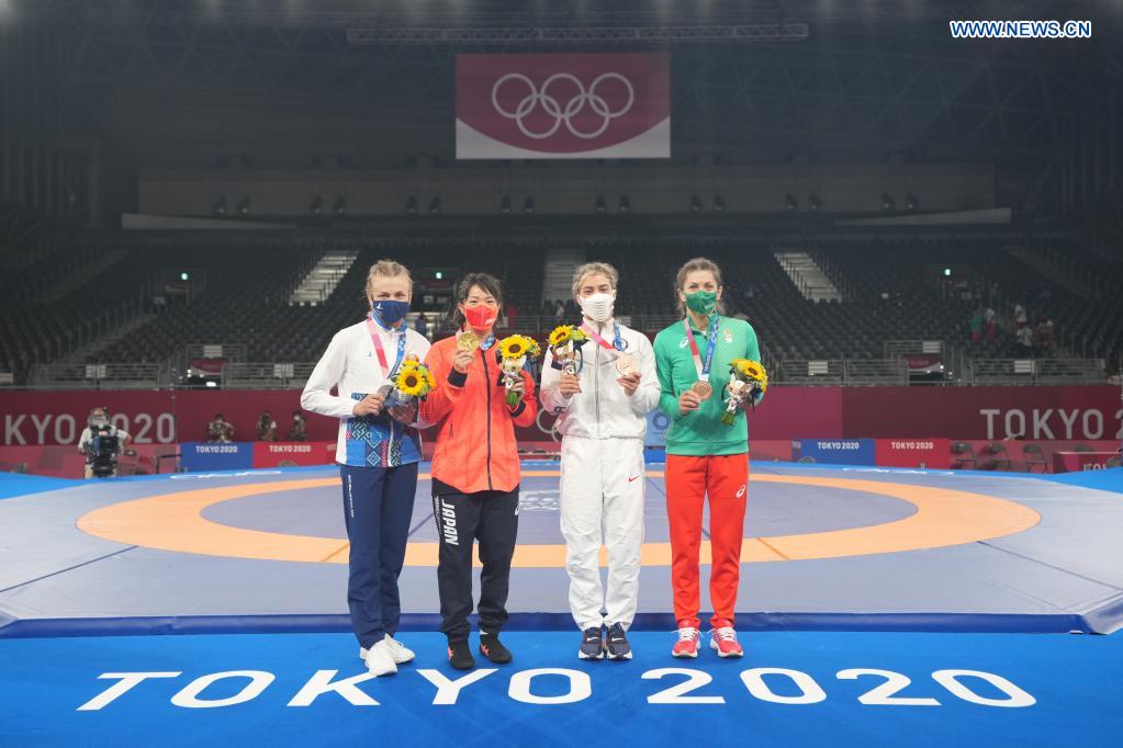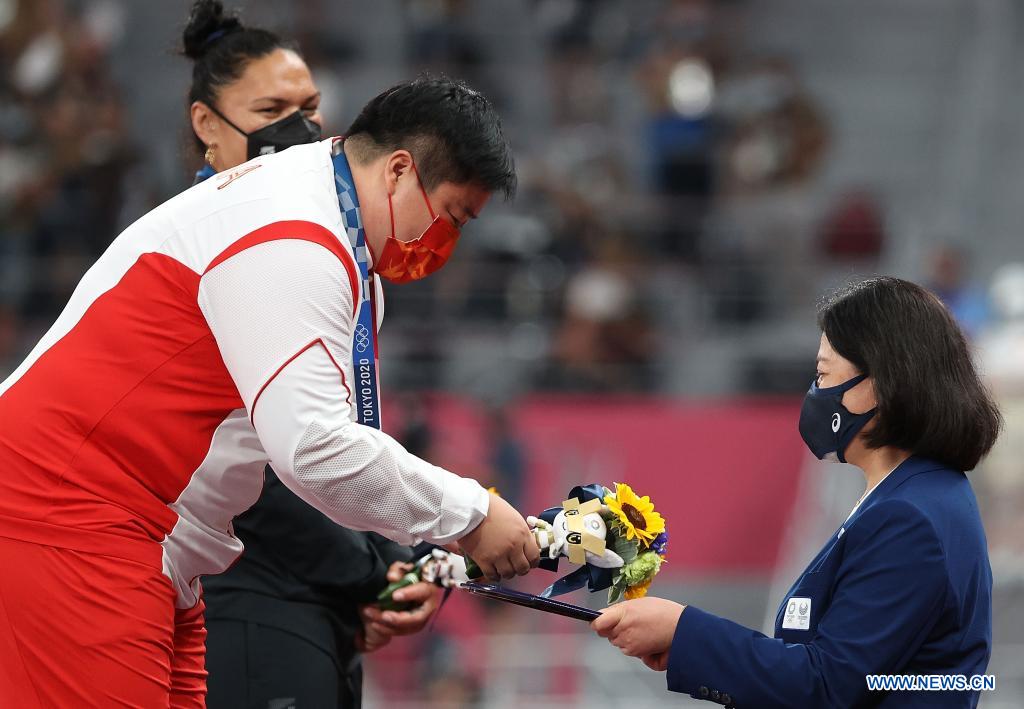 Gong Lijiao of China reacts during the awarding ceremony of the Women's Shot Put at the Tokyo 2020 Olympic Games in Tokyo, Japan, Aug. 1, 2021. (Xinhua/Ju Huanzong)