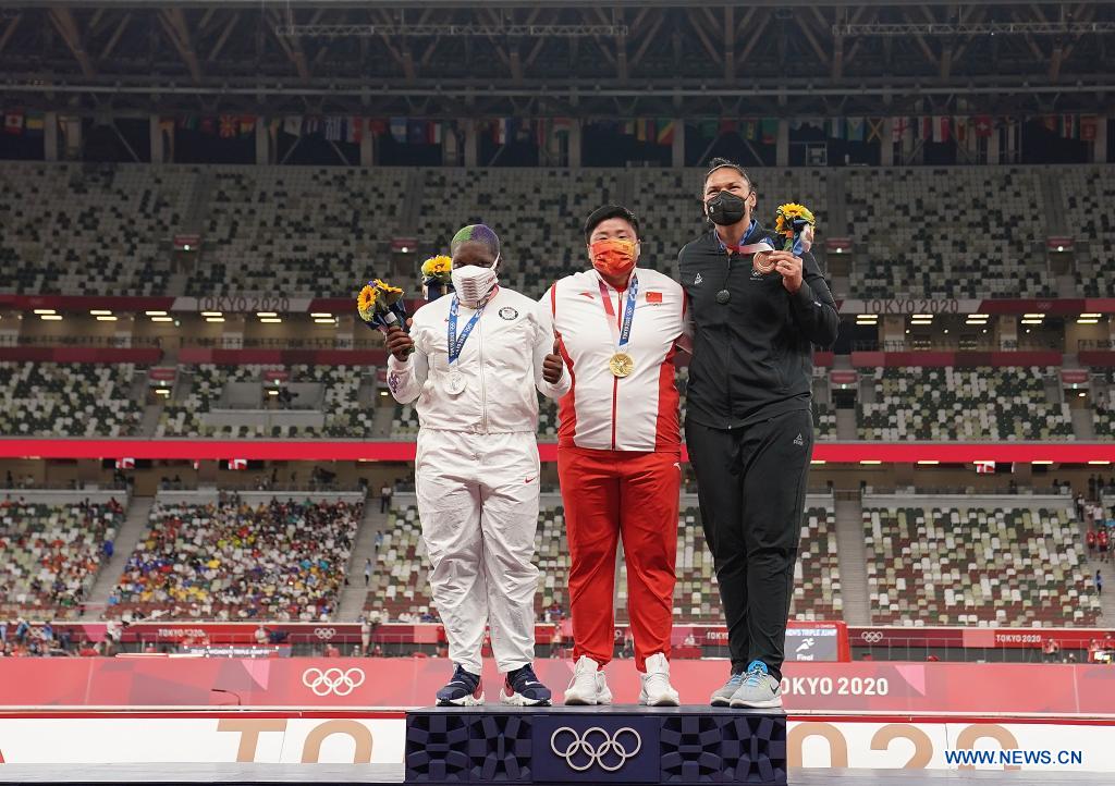 Gold medalist Gong Lijiao (C) of China, silver medalist Raven Saunders (L) of the United States and bronze medalist Valerie Adams of New Zealand react during the awarding ceremony of the Women's Shot Put at the Tokyo 2020 Olympic Games in Tokyo, Japan, Aug. 1, 2021. (Xinhua/Li Ming)