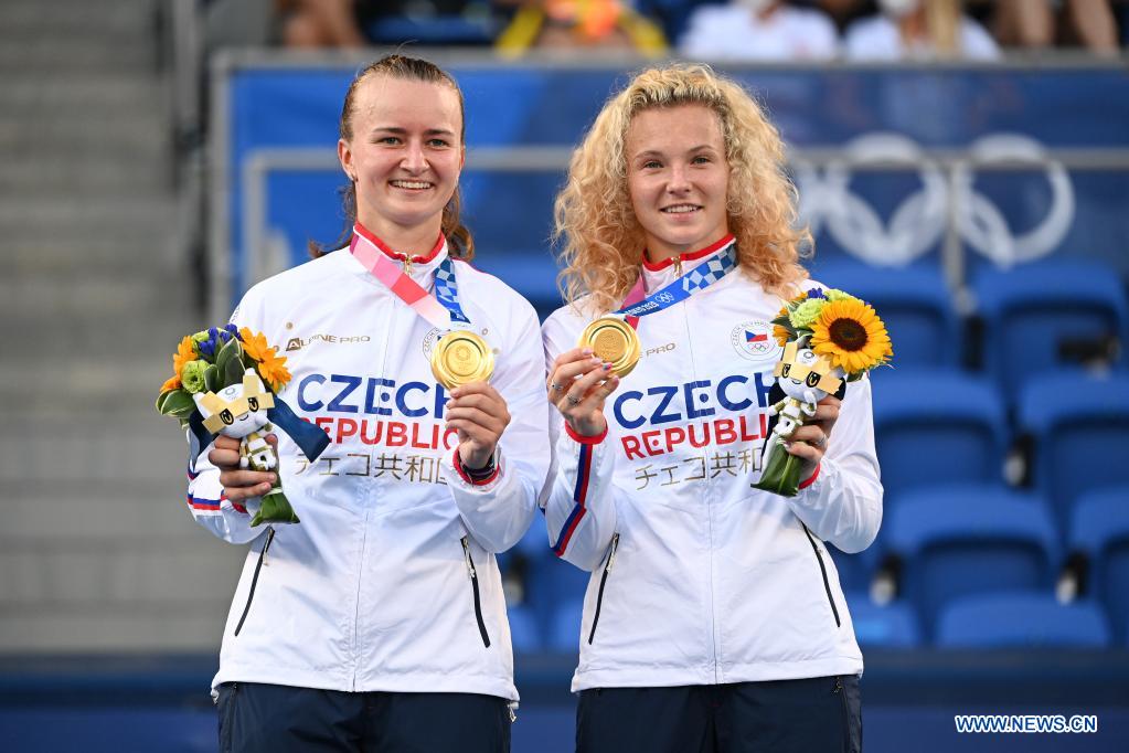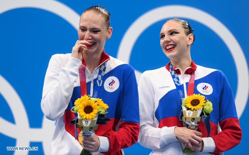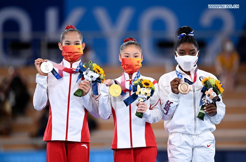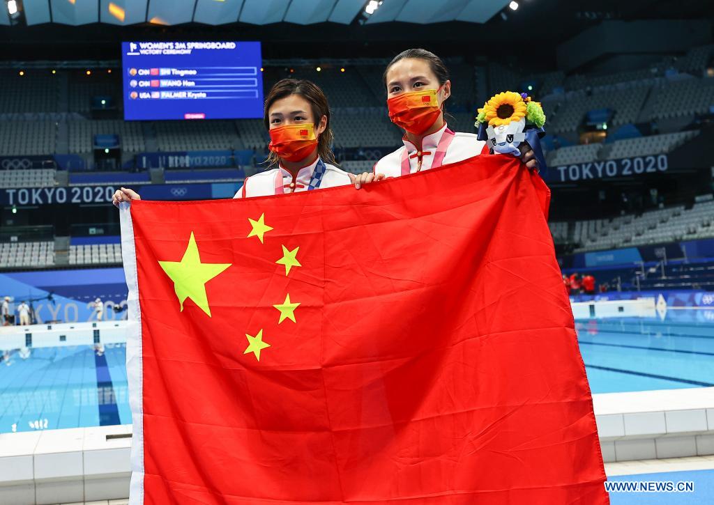 Photo taken on Aug. 1, 2021 shows the awarding ceremony for the women's 3m springboard final of diving at Tokyo 2020 Olympic Games in Tokyo, Japan. (Xinhua/Wang Jingqiang)