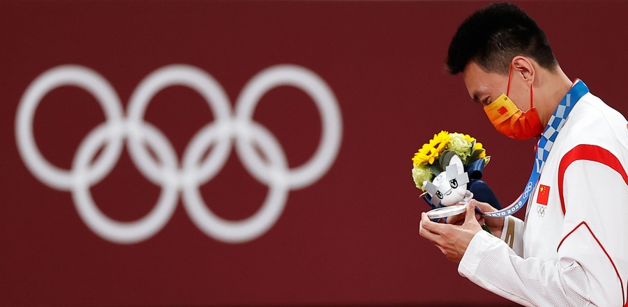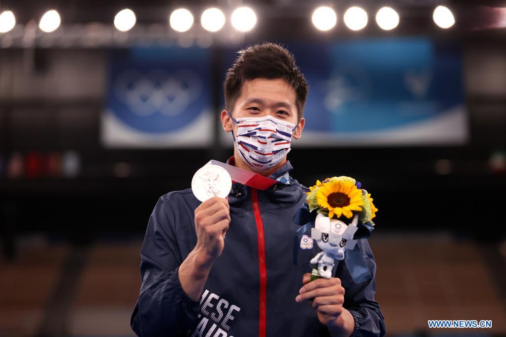 Silver medalist Zhu Yaming of China reacts on the awarding ceremony of the men's triple jump at the Tokyo 2020 Olympic Games in Tokyo, Japan, Aug. 5, 2021. (Xinhua/Wang Lili)