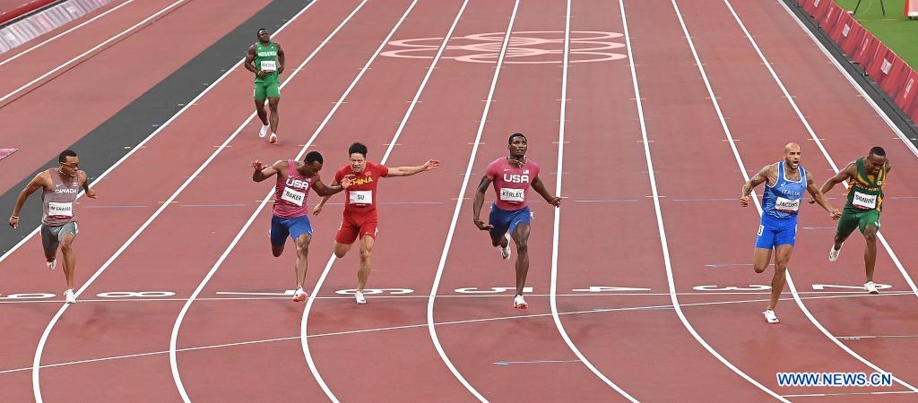 Su Bingtian of China reacts after the Men's 100m Final at the Tokyo 2020 Olympic Games in Tokyo, Japan, Aug. 1, 2021. (Xinhua/Li Ming)