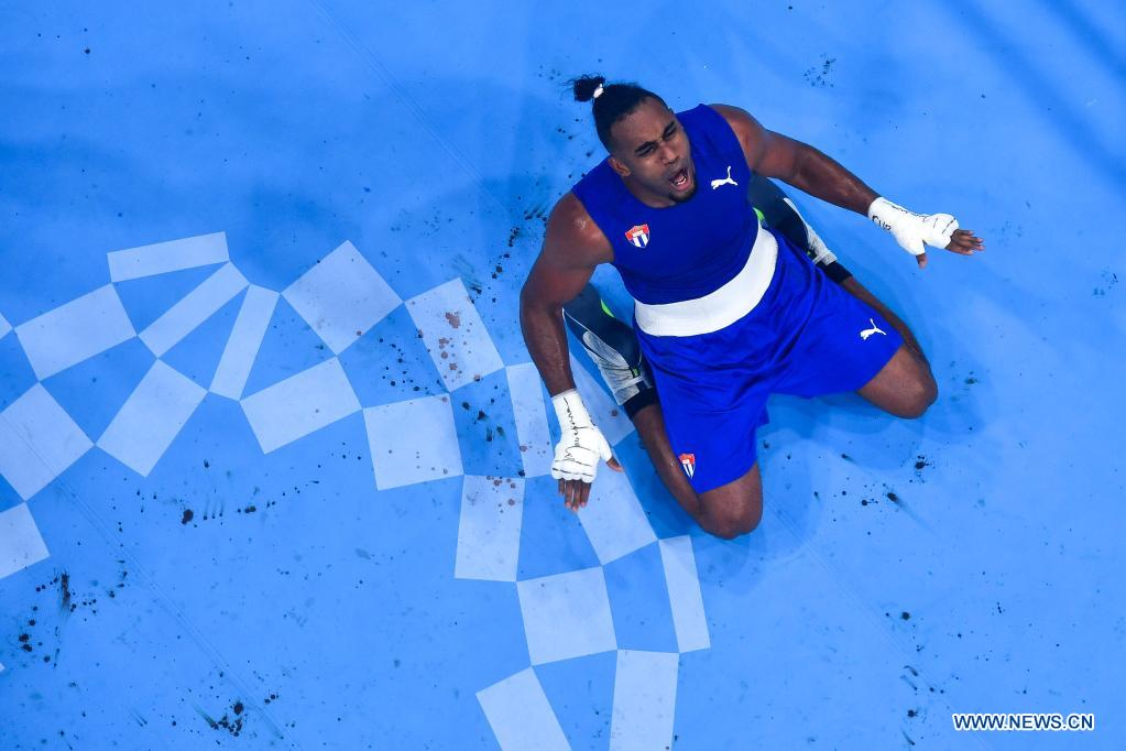 Wang Zheng of China celebrates after the Women's Hammer Throw Final at the Tokyo 2020 Olympic Games in Tokyo, Japan, Aug. 3, 2021. (Xinhua/Wang Lili)