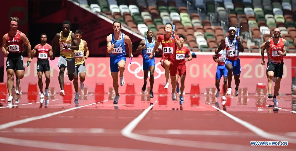 Su Bingtian (1st R) and Wu Zhiqiang (3rd R) of China compete during the Men's 4x100m Heat at the Tokyo 2020 Olympic Games in Tokyo, Japan, Aug. 5, 2021. (Xinhua/Wang Lili)