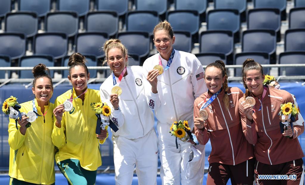 Haleigh Washington (L) of Team USA reacts on the awarding ceremony of the women's volleyball at Tokyo 2020 Olympic Games, in Tokyo, Japan, Aug. 8, 2021. (Xinhua/Ding Ting)