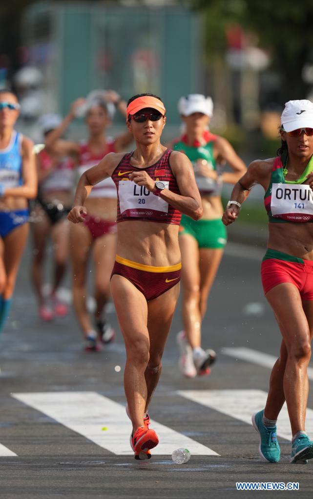 Liu Hong of China celebrates after the women's 20km race walk final at the Tokyo 2020 Olympic Games in Sapporo, Japan, Aug. 6, 2021. (Xinhua/Guo Chen)