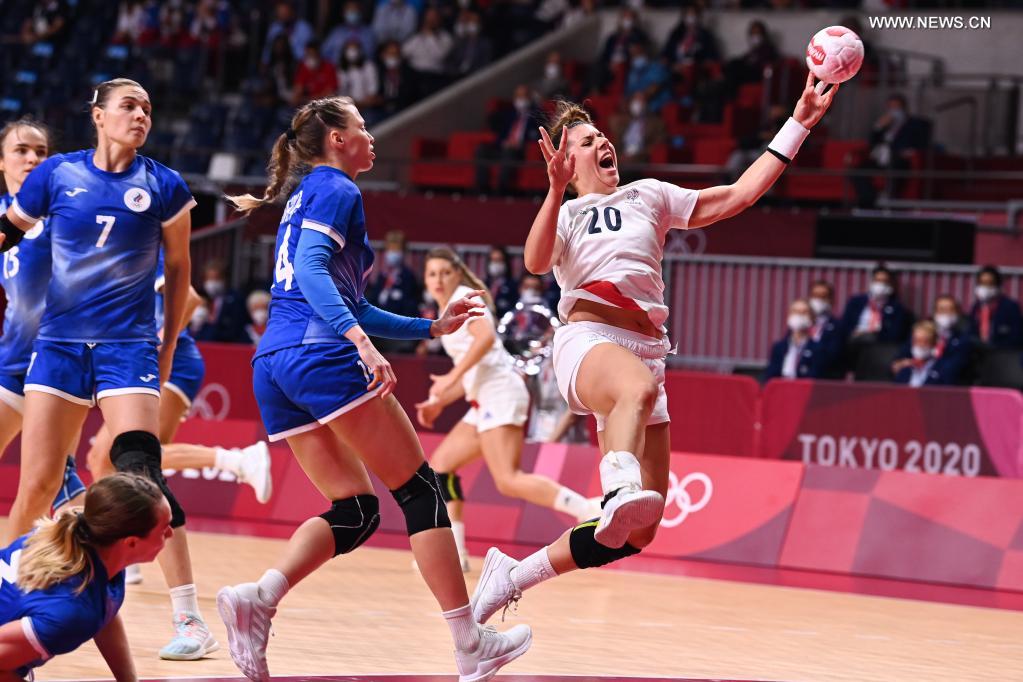Kseniia Makeeva (2nd L) of ROC competes during the women's handball gold medal match between France and ROC at Tokyo 2020 Olympic Games in Tokyo, Japan, Aug 8, 2021. (Xinhua/Huang Zongzhi)