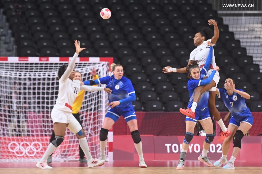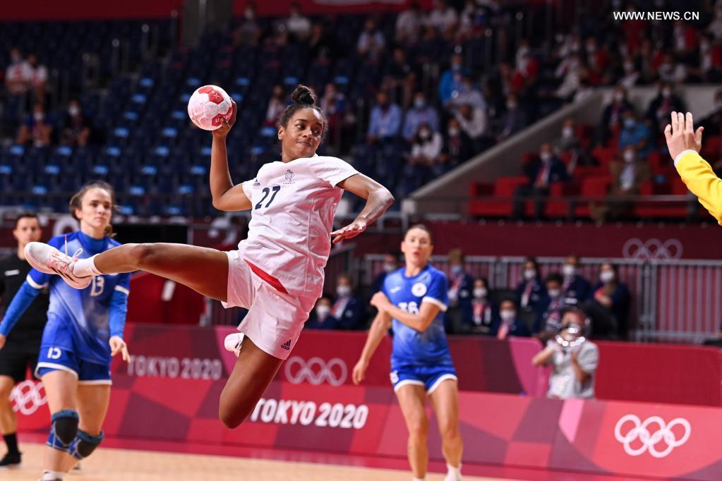 Grace Zaadi Deuna (L front) of France attacks during the women's handball gold medal match between France and ROC at Tokyo 2020 Olympic Games in Tokyo, Japan, Aug 8, 2021. (Xinhua/Du Yu)