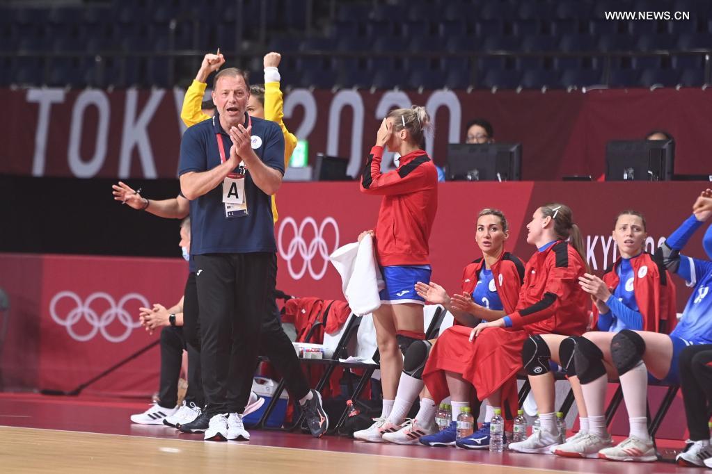 Alexey Alekseev (1st L), head coach of ROC reacts during the women's handball gold medal match between France and ROC at Tokyo 2020 Olympic Games in Tokyo, Japan, Aug 8, 2021. (Xinhua/Huang Zongzhi)