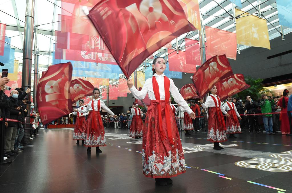 12月22日,演员在国家大剧院北门入口处敲响迎宾鼓,拉开活动序幕。新华社记者 罗晓光 摄