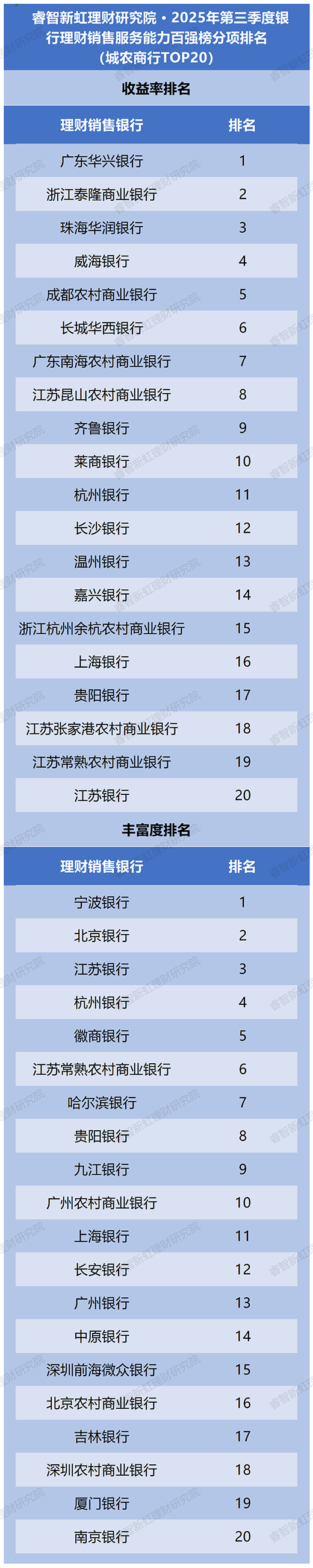 表3 2025年第三季度银行理财销售服务能力百强榜分项排名(城农商行TOP20)