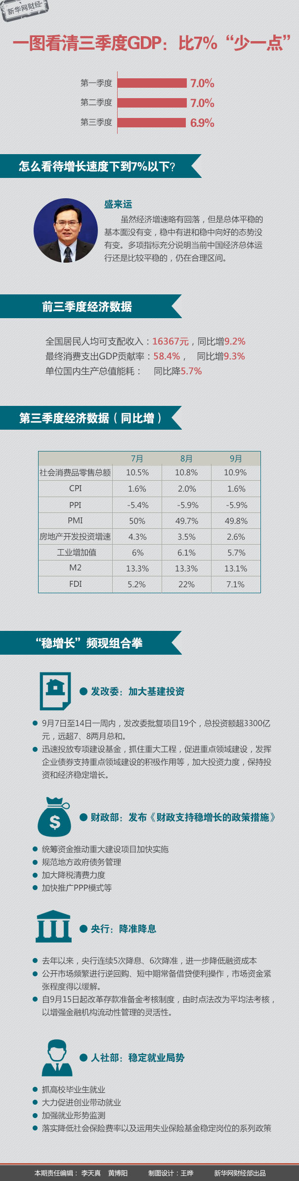 ????新華網(wǎng)北京10月19日電(記者 徐曼曼)備受關(guān)注的中國經(jīng)濟(jì)“三季報”今日揭開面紗。國家統(tǒng)計局?jǐn)?shù)據(jù)顯示,三季度GDP同比增幅為6.9%,創(chuàng)下自2009年以來的最低增速,系官方首次以分季方式核算的GDP數(shù)據(jù)。初步核算,前三季度國內(nèi)生產(chǎn)總值487774億元,按可比價格計算,同比增長6.9%。