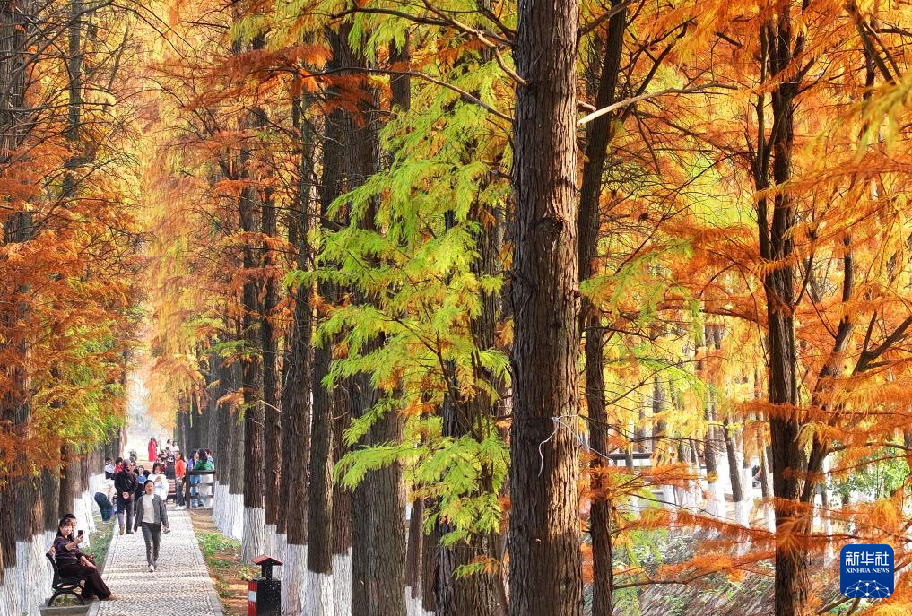 12月10日,游客在湖南省衡阳市雁峰区岳屏镇隆桥村的水杉林休闲游玩(无人机照片)。