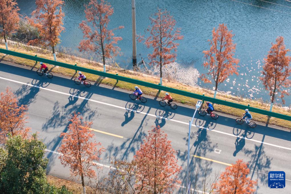 12月7日,在安徽省芜湖市繁昌区繁阳镇范马村,自行车运动爱好者在风景如画的淮九公路上骑行(无人机照片)。