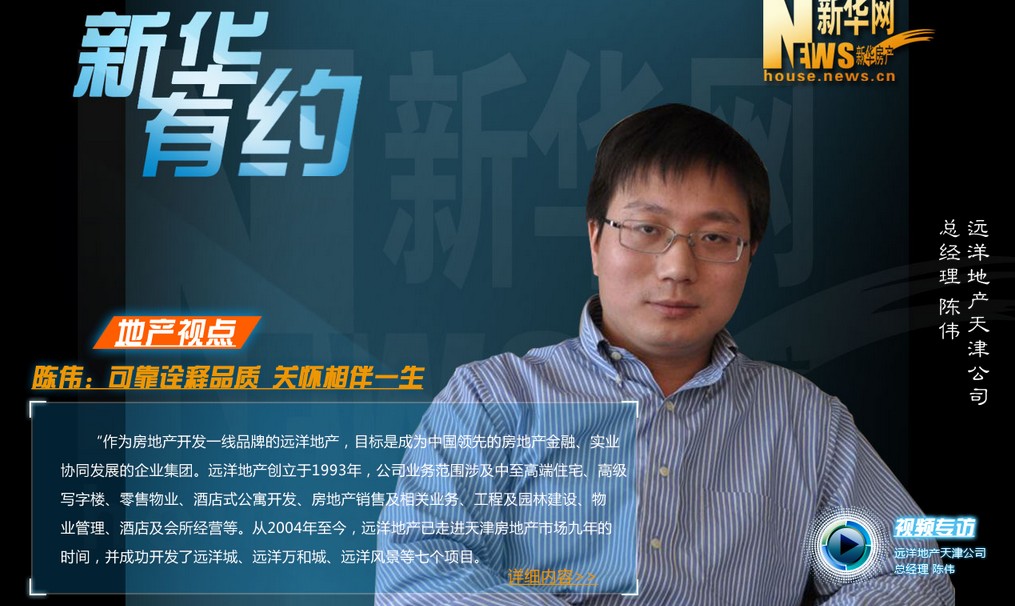作為房地產(chǎn)開發(fā)一線品牌的遠(yuǎn)洋地產(chǎn),目標(biāo)是成為中國領(lǐng)先的房地產(chǎn)金融、實(shí)業(yè)協(xié)同發(fā)展的企業(yè)集團(tuán)。遠(yuǎn)2004年至今,遠(yuǎn)洋地產(chǎn)已走進(jìn)天津房地產(chǎn)市場九年的,并成功開發(fā)了遠(yuǎn)洋城、遠(yuǎn)洋萬和城、遠(yuǎn)洋風(fēng)景等七個(gè)項(xiàng)目。新華網(wǎng)新華房產(chǎn)榮幸的邀請到遠(yuǎn)洋地產(chǎn)天津公司總經(jīng)理陳偉,共同分享遠(yuǎn)洋地產(chǎn)在天津的成長之路。