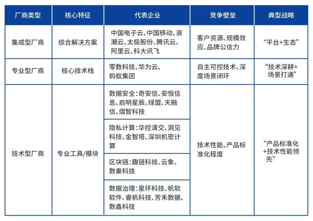 可信数据空间市场已形成“集成型主导平台生态、专业型穿透核心场景、技术型夯实基础设施”的协同发展格局。市场参与主体呈现“三类四级”的立体化竞争格局,集成型、专业型与技术型厂商基于各自核心能力构筑差异化优势。集成型厂商以中国电子云、中国移动等为代表,核心优势在于其卓越的产品组件完备度与庞大的生态伙伴数量。专业型厂商以零数科技、华为云等为代表,核心竞争力在于数据要素流通领域的技术纵深突破与场景价值深耕。技术型厂商包括隐私计算、区块链、数据治理等细分领域厂商,是生态中不可或缺的专业力量。