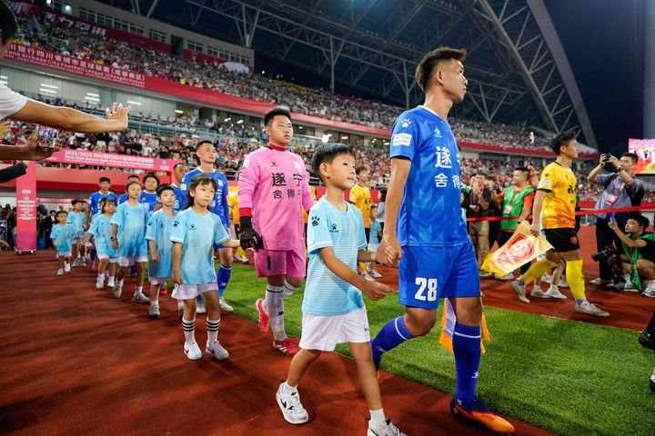 9月20日,成都锦城队和遂宁舍得干队球员入场。新华社记者 胥冰洁摄