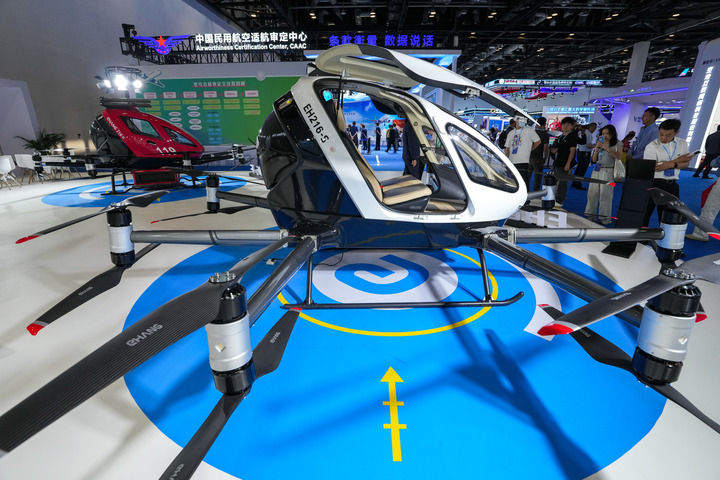 在第三届民航科教创新成果展的亿航智能公司展区,参观者在参观展出的可应用于城市空中交通的无人驾驶载人航空器。新华社记者 鞠焕宗 摄