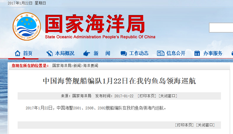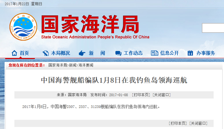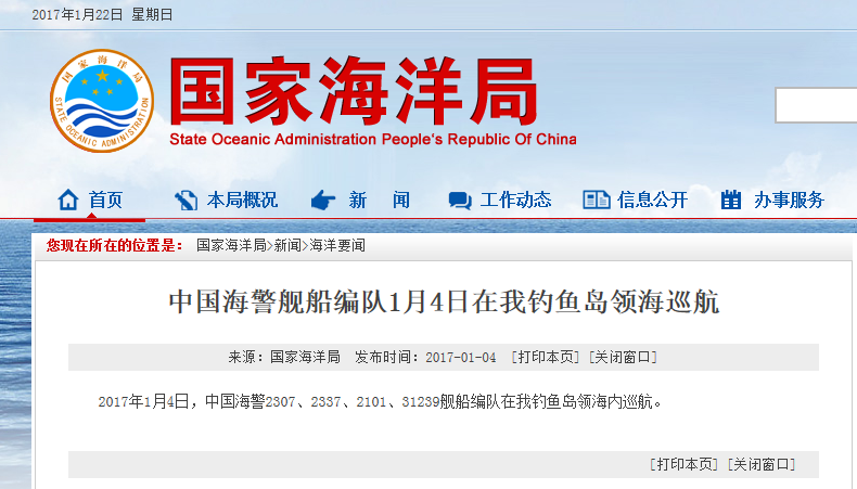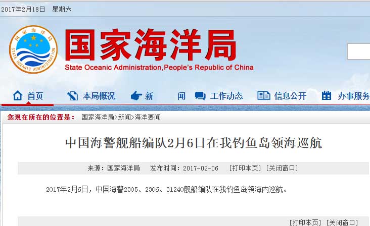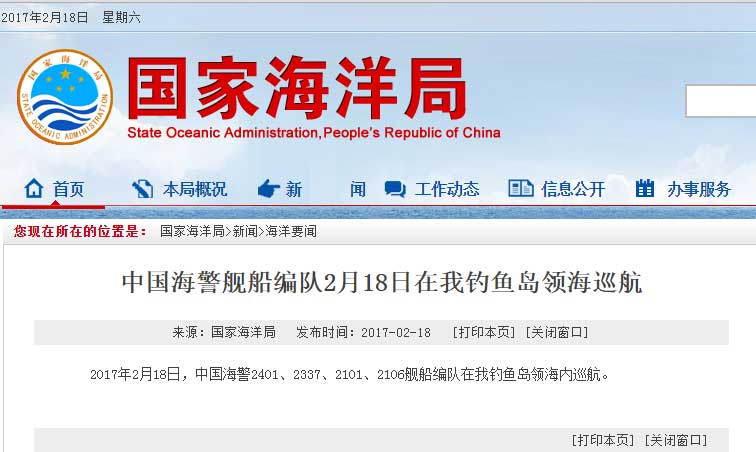 新華網(wǎng)北京2月18日電 據(jù)國(guó)家海洋局網(wǎng)站報(bào)道,2017年2月18日,中國(guó)海警2401、2337、2101、2106艦船編隊(duì)在我釣魚(yú)島領(lǐng)海內(nèi)巡航。