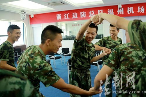 ????“快樂(lè)其實(shí)很簡(jiǎn)單,用你的左手傳遞你的快樂(lè),用你的右手接納別人的快樂(lè)……”浙江公安邊防總隊(duì)溫州機(jī)場(chǎng)邊檢站官兵正在心理教官的引導(dǎo)下開(kāi)展心理減壓輔導(dǎo)活動(dòng)。
