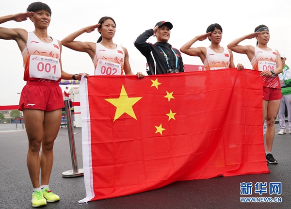 10月23日,中國隊(duì)成員在女子個人全能越野跑比賽后手持國旗敬禮。當(dāng)日,第七屆世界軍人運(yùn)動會女子個人全能項(xiàng)目比賽在武漢陸軍工程大學(xué)軍械士官學(xué)校結(jié)束,中國選手盧嬪嬪以5627.2分的總成績獲得冠軍,隊(duì)友管超楠以5567.6分的總成績獲得亞軍,王堂林以5506.3分的總成績獲得季軍,孫洪燕以5474.1的總成績獲得第四名。新華社記者 王建威 攝