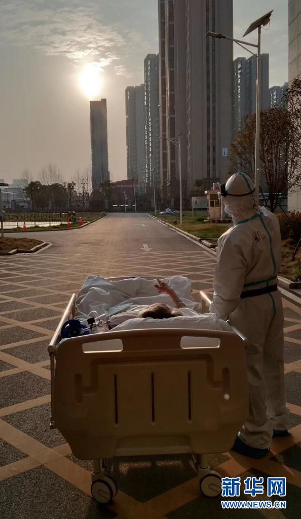 2020年3月5日傍晚,在湖北省武漢大學(xué)人民醫(yī)院東院,復(fù)旦大學(xué)附屬中山醫(yī)院支援湖北醫(yī)療隊醫(yī)生在護(hù)送患者王欣做CT的途中停下,讓住院近一個月的老人欣賞久違的日落。新華社發(fā)(甘俊超 攝)