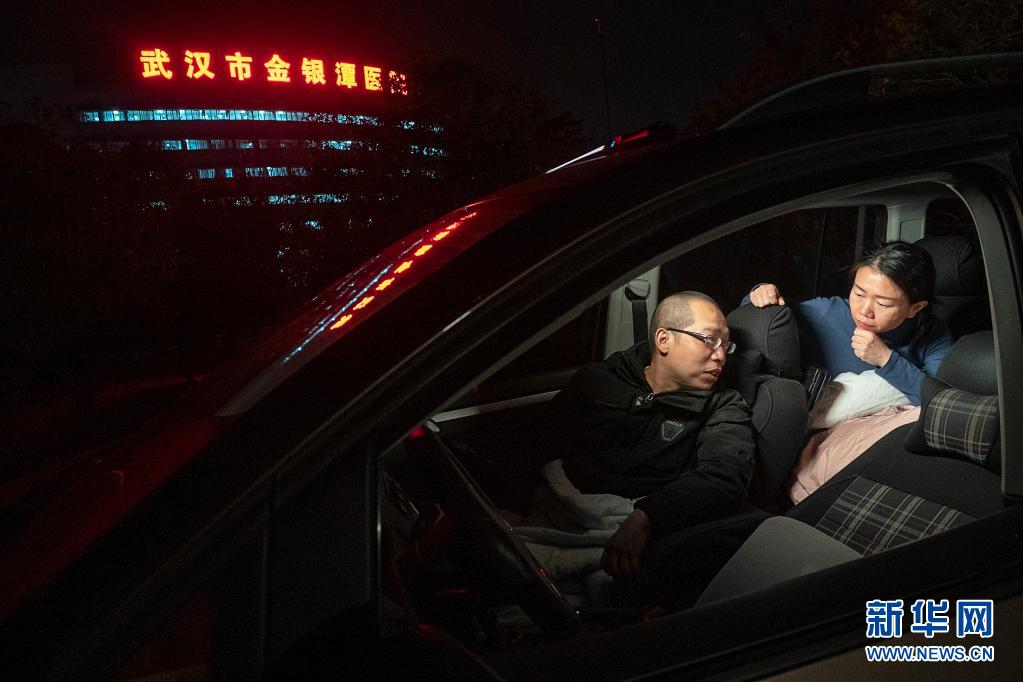 2020年2月22日晚,武漢市金銀潭醫(yī)院的醫(yī)護(hù)夫妻涂盛錦(左)與曹珊在車內(nèi)聊天。從大年初一開始,兩人就住進(jìn)車?yán)铮瑸樵谝咔橹袚尵炔』?,爭分奪秒,以車為家。新華社記者 熊琦 攝