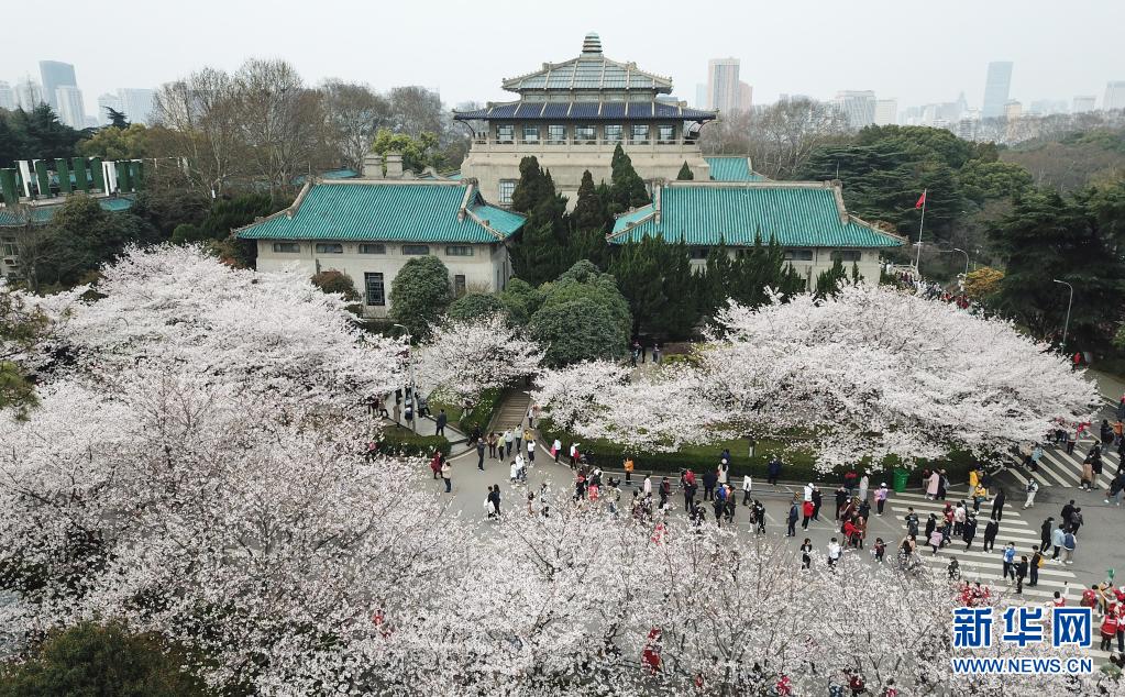 3月13日,武漢大學(xué)抗疫醫(yī)護(hù)人員賞櫻專場(chǎng)啟動(dòng),來(lái)自全國(guó)各地的援鄂抗疫英雄在櫻花樹(shù)下重逢,盡享櫻花之約(無(wú)人機(jī)照片)。新華社記者 程敏 攝