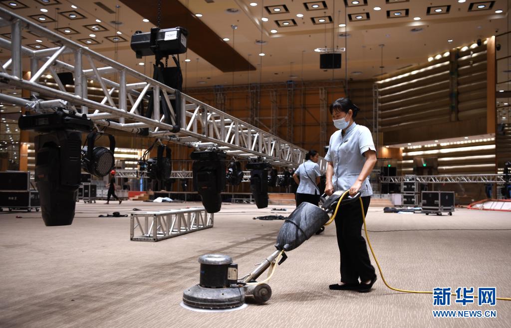 4月10日,工作人員在對(duì)主會(huì)場進(jìn)行清潔作業(yè)。
