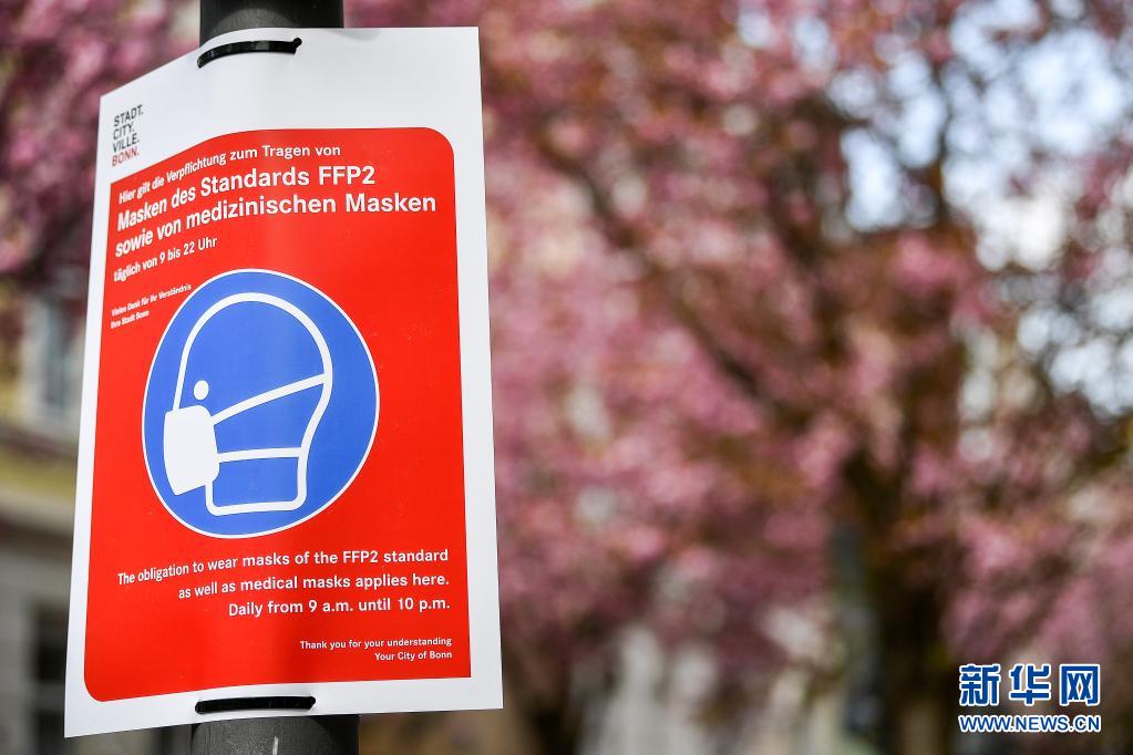4月13日,德國(guó)波恩老城區(qū)的櫻花樹下張貼著提示游人佩戴醫(yī)用口罩的標(biāo)識(shí)。