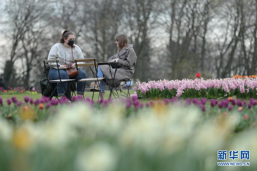 4月14日,參觀者坐在比利時布魯塞爾以西的拜加登城堡的鮮花旁休息聊天。