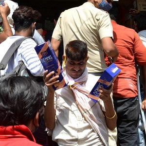 4月19日,印度新德里居民在全城實施封鎖前搶購酒品。