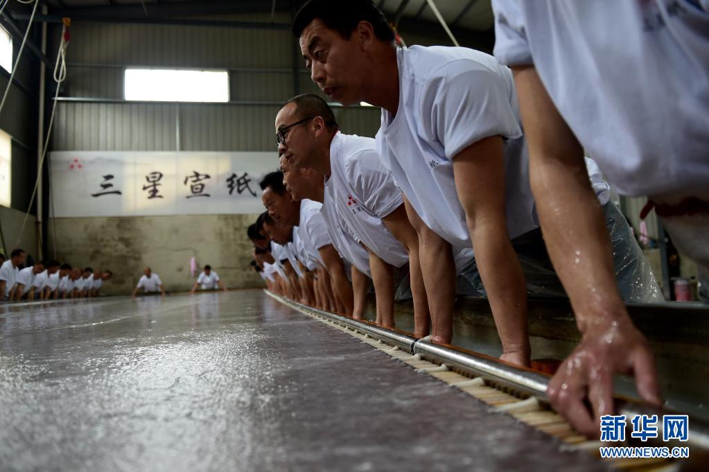 近日,在宣紙產(chǎn)地安徽省宣城市涇縣,“四丈宣紙”的抄制在一家紙業(yè)有限公司啟動。50余名撈紙師傅操作巨型紙簾,齊心協(xié)力,在紙槽旁進行撈紙作業(yè)。來回起落兩次,動作整齊劃一。隨后工人們將紙簾吊起放至一邊揭下,一張巨大的宣紙便撈制成功。經(jīng)過曬、剪等工序后, 制成長13.2米、寬3.6米的巨型宣紙就是“四丈宣紙”。