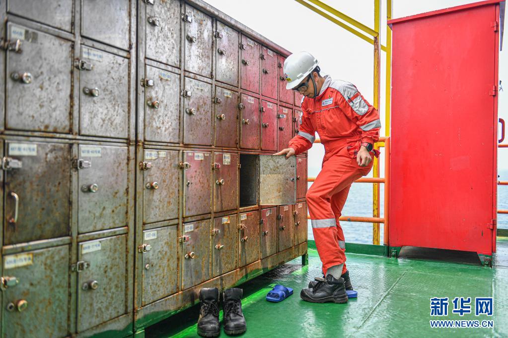 4月25日,中國(guó)海油樂東15-1氣田上的一名工人在進(jìn)入氣田作業(yè)區(qū)之前戴上安全帽并換上有助于保護(hù)腳部的工作靴。