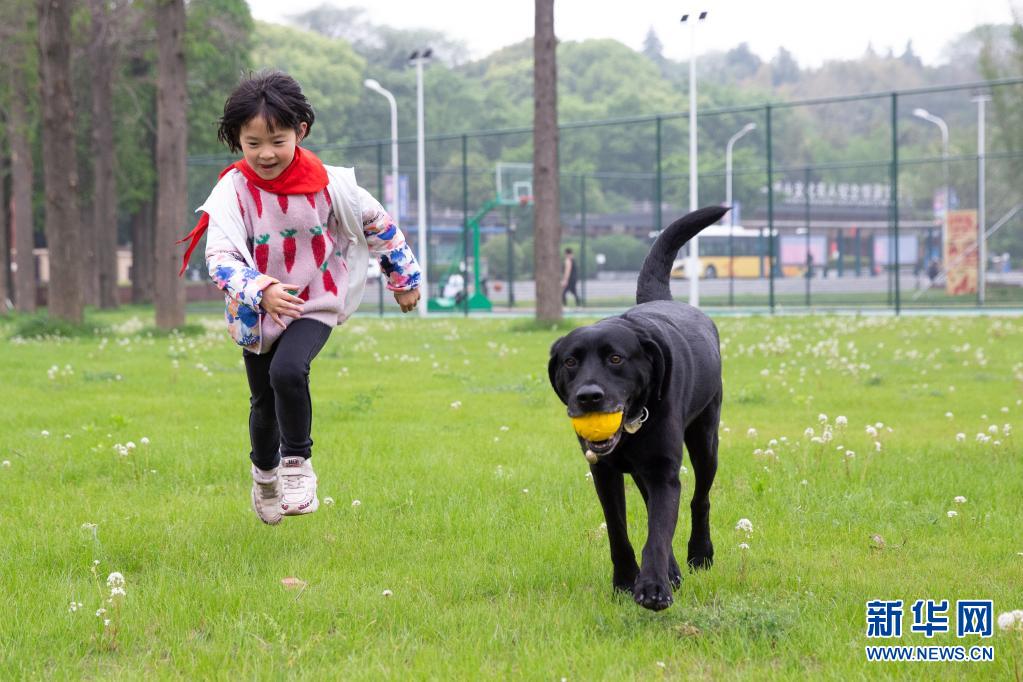 導(dǎo)盲犬“C羅”和吳虎剛的女兒在草地上玩耍(4月26日攝)?! ⌒氯A社發(fā) (張夢 攝)