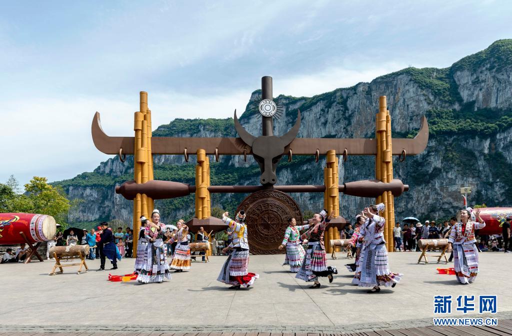 5月1日,在貴州省畢節(jié)市黔西縣新仁苗族鄉(xiāng)化屋景區(qū)文化廣場(chǎng)上,村民為游客表演苗族歌舞。