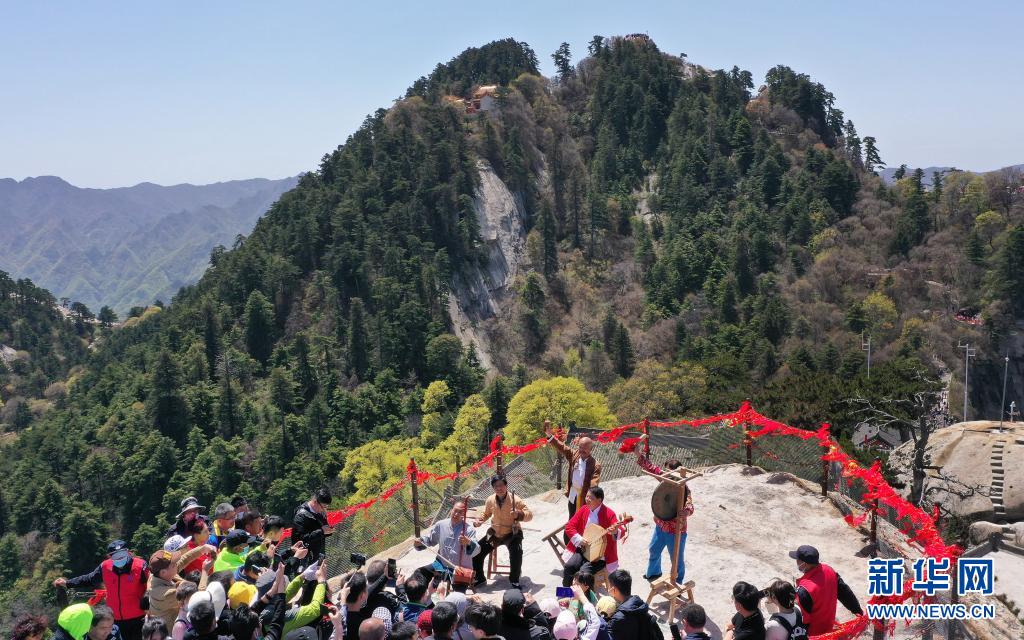 5月5日,華山景區(qū)西峰索道“華陰老腔團(tuán)”在華山西峰之巔為游客表演(無(wú)人機(jī)照片)。